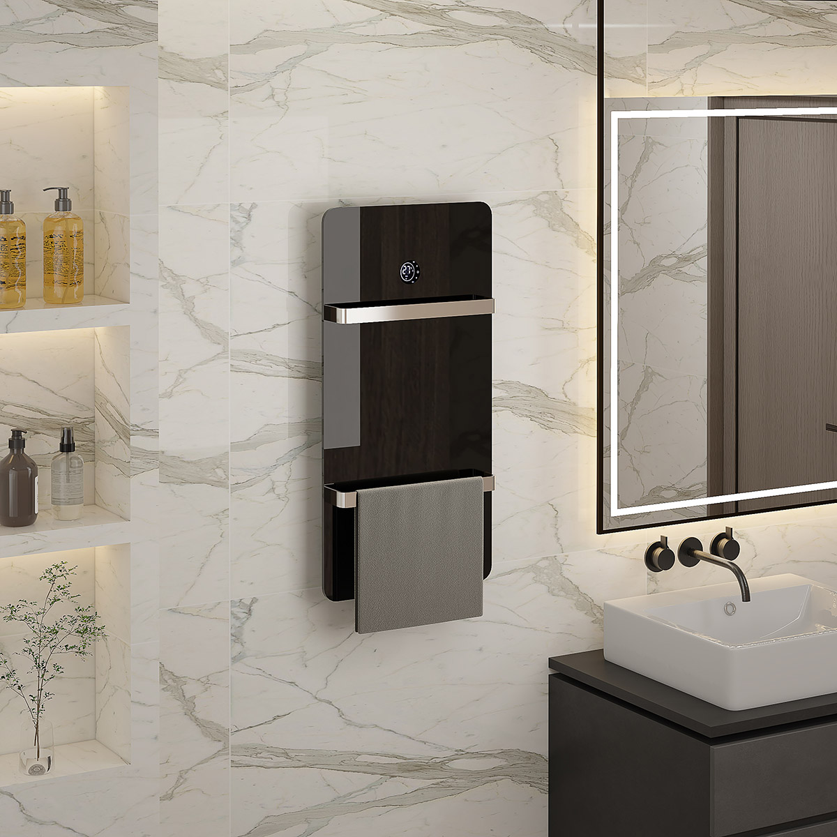 板式液顯多功能開(kāi)關(guān)電熱毛巾架 Panel LCD display multifunction switch heated towel rail 材質(zhì)Material:Glass 玻璃 功率Power:220V/140W 表面Surface:Black 黑色 尺寸Size:400*130*800mm 包裝Ctn size:440*150*860mm