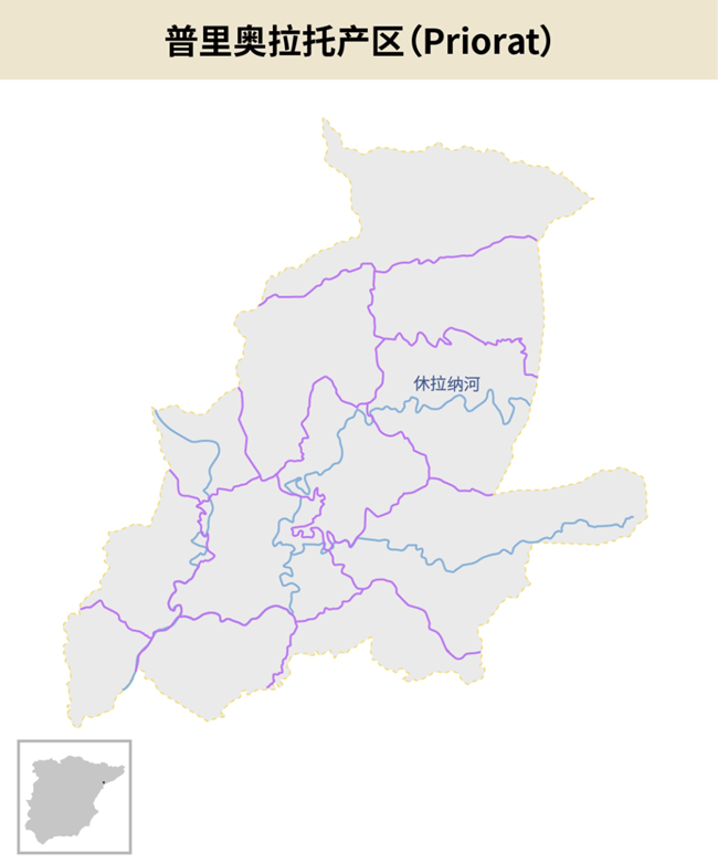 普里奧拉托產區位于西班牙加泰羅尼亞(Catalonia)地區、塔拉戈納(Tarragona)省的中心。該產區靠近西班牙東北部的地中海沿岸,北部是蒙桑特山脈(Montsant Mountain),埃布羅河(Ebro River)的支流休拉納河(Siurana River)貫穿整個產區。