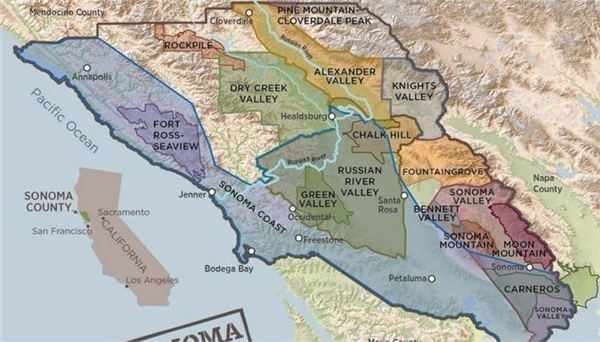 知名的納帕谷AVA旁邊,其實有一個較鮮為人知但圈內人很推崇的大產區(qū),叫索諾馬 (Sonoma) AVA,其緯度、氣候與納帕谷相當,區(qū)域面積更廣,也更靠近海洋,整體而言更能凸顯風土變化,因此更能夠找到適合每一品種的區(qū)域進行種植。