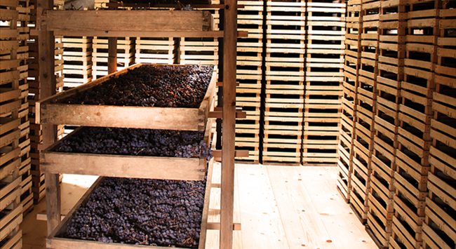 常見的風干工藝之一是將果實留在葡萄藤上進行自然風干,待葡萄在藤上變干、糖分得到高度濃縮之后再采收,用于釀造甜酒。此種工藝對天氣條件有特定的要求,葡萄必須在溫暖干燥的秋季才能風干,否則會容易感染灰霉菌。在法國蘇玳(Sauternes)產區,倘若葡萄沒有成功感染貴腐菌,一些酒莊便會采用此方法幫助葡萄濃縮糖分,釀造出風味濃郁、口感美妙的甜酒。用這種方式釀造出的葡萄酒有時會在酒標上標注“晚采收(Late Harvest)”。另外,也可將采摘后的葡萄鋪在草席上于室外曬干,又或者把葡萄放置于干燥通風的屋子中風干〔此風干工藝在意大利瓦坡里切拉(Valpolicella)產區廣泛使用,在當地被稱作“枯藤法”(Appassimento)〕。風干后的葡萄流失了大量水分,果實中的糖分和風味物質得以濃縮,因此釀成的葡萄酒擁有飽滿的酒體和較高的酒精度,風味也十分濃郁。
