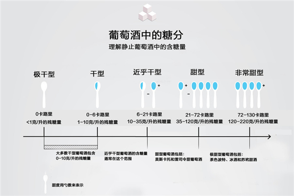 國際上還有一種通用的量化方法,那就是用勺數來表示,詳見下圖。一個標準勺為 1 盎司(約等于 28.35 克),如下圖所示,干型的殘糖量范圍被形象的表示為 0 勺到 1/3 勺之間,近乎干殘糖量的范圍被表示為 1/3 勺至1勺+之間。
