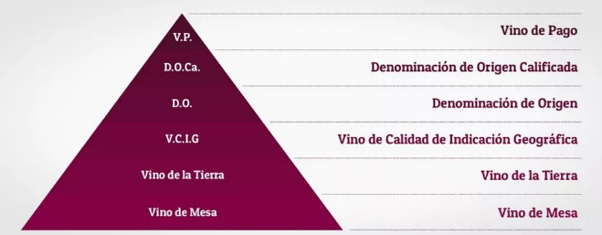 根據上面的圖片,我們可以看到,西班牙葡萄酒可以粗分為三個大的級別,他們由高到低分別是: