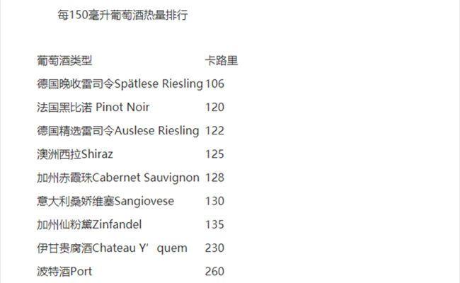 不同葡萄品種的葡萄酒在熱量上也會有差別。如果你對上表感到迷惑,而且對卡路里的數(shù)字又很敏感,下方表格內(nèi)的數(shù)字可以提供更加具體的參考。