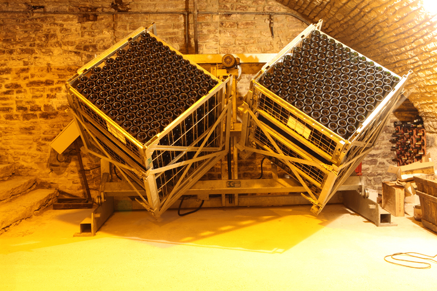 在經過這個漫長的時期之后,需要去除在二次發酵過程中形成的沉淀物,使葡萄酒重新變得清澈。轉瓶的工序指的是每天轉動瓶口朝下放置的葡萄酒瓶,以便使沉淀物集中在瓶子的頸部,使其能夠在冷卻除渣(dégorgement)的工序中被取出。