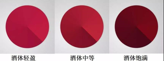 酒體輕盈的紅葡萄酒,如黑皮諾(Pinot Noir)和佳美(Gamay),顏色是從洋紅到石榴紅;酒體中等的紅葡萄酒,如梅洛(Merlot)和桑嬌維塞(Sangiovese),顏色比輕酒體的紅葡萄酒深,有點(diǎn)類似由淺到深的磚紅色;酒體飽滿的紅葡萄酒,如西拉(Syrah)和赤霞珠(Cabernet Sauvignon),顏色深濃,透明度很低。