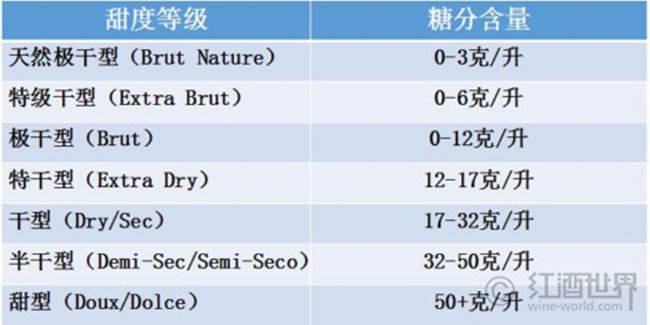 以上的分類方法主要適用于靜止葡萄酒,而起泡酒則根據(jù)糖分含量有單獨(dú)的分類方式: