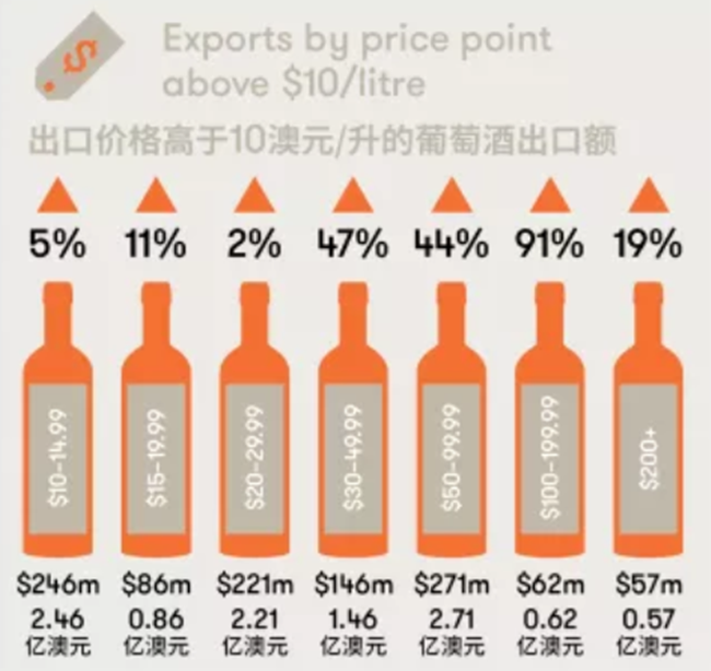 另外一個突出的部分是價格區(qū)間在30澳元或以上(離岸價)的葡萄酒出口額的增長,凸顯了市場對澳大利亞最優(yōu)質(zhì)葡萄酒日益增長的需求。