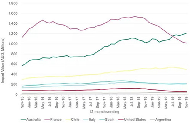 近日,澳大利亞葡萄酒管理局公布了最新出口報告。截至2019年12月底的12個月,澳大利亞葡萄酒對中國市場的出口總額及平均出口額雙雙創下年度新高。