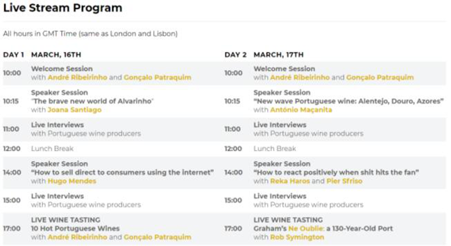 3月16日-17日,舉辦了為期兩天的虛擬現場直播交易活動,免費幫助葡萄牙葡萄酒生產商展示他們計劃帶到國際貿易博覽會參展的葡萄酒。直播貿易目前以免費的形式進行,開放注冊。