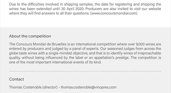 針對(duì)目前流行的Covid-19新型冠狀病毒對(duì)于全球的影響,在經(jīng)過(guò)組委會(huì)與主辦地的積極協(xié)商后,現(xiàn)決定“2020(捷克·布爾諾)比利時(shí)布魯塞爾國(guó)際葡萄酒大獎(jiǎng)賽”將延期至2020年6月26日至28日舉辦。同時(shí),為了緩解報(bào)名企業(yè)的物流運(yùn)輸壓力,全球樣品征集截止時(shí)間也將適度順延。
