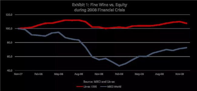 精品葡萄酒投資公司Cult Wines近日也發布了一份關于精品葡萄酒投資的統計分析報告,報告稱在2007年11月至2009年11月的整個金融危機期間,Liv-ex 1000指數的表現始終優于摩根士丹利資本國際全球指數(Morgan Stanley Capital International Index,簡稱MSCI指數,是一個市值加權股票市場指數)。