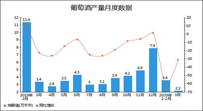 2020年3月全國葡萄酒產量為2.2萬千升,累計值為5.8萬千升,同比下降31.3%,累計下降40.8%。