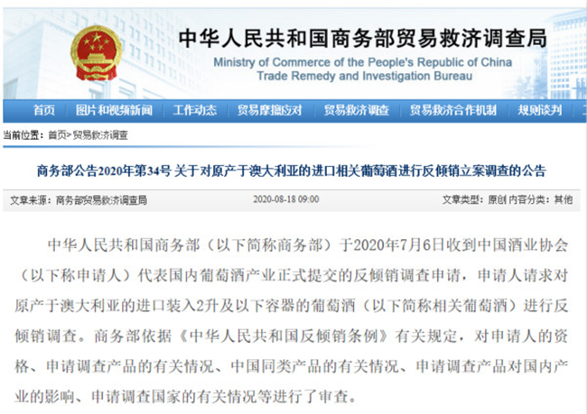 自本公告發布之日起,商務部對原產于澳大利亞的進口相關葡萄酒進行反傾銷立案調查,本次調查確定的傾銷調查期為2019年1月1日至2019年12月31日,產業損害調查期為2015年1月1日至2019年12月31日。
