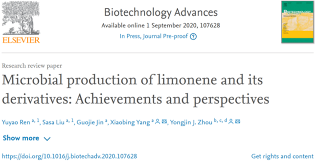 近日,葡萄酒學(xué)院楊曉兵副教授團(tuán)隊(duì)在著名生物技術(shù)學(xué)術(shù)期刊《Biotechnology Advances》(IF=10.744)發(fā)表了題為 “Microbial production of limonene and its derivatives: Achievements and perspectives” 的綜述文章,系統(tǒng)總結(jié)了近年來利用代謝工程和合成生物學(xué)策略合成檸檬烯及其衍生物研究進(jìn)展。西北農(nóng)林科技大學(xué)為第一署名單位,中科院大連化學(xué)物理研究所為合作單位;16級(jí)本科生任毓瑤和18級(jí)博士研究生劉灑灑為共同第一作者,我校楊曉兵副教授與大連化物所周雍進(jìn)研究員為共同通訊作者,我校靳國杰副教授參與了該綜述的撰寫工作。《Biotechnology Advances》是生物技術(shù)領(lǐng)域頂級(jí)國際期刊,在105種應(yīng)用微生物與生物技術(shù)相關(guān)的雜志中排名第3,該雜志全年收錄文章在100篇左右,2019年H指數(shù)161。