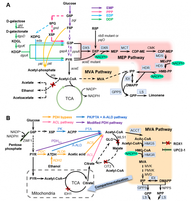 楊曉兵副教授團(tuán)隊(duì)長期致力于利用代謝工程和合成生物學(xué)策略構(gòu)建高價(jià)值化合物細(xì)胞工廠的研究工作。目前,已利用代謝工程策略成功改造圓紅冬孢酵母(Rhodosporidium toruloides)構(gòu)建了檸檬烯等單帖化合物、羥基化脂肪酸、氨基酸衍生物的細(xì)胞工廠,其中檸檬烯微生物合成相關(guān)研究工作獲得陜西省面上基金(2020JM177)、學(xué)??蒲袉?dòng)基金、國家級(jí)科創(chuàng)等支持,指導(dǎo)2016本科生任毓瑤畢業(yè)論文獲得校級(jí)畢業(yè)論文。該綜述介紹了微生物合成檸檬烯及其衍生物面臨的機(jī)遇與挑戰(zhàn),詳細(xì)闡述了異戊二烯途徑多樣性、代謝路徑關(guān)鍵酶的發(fā)掘與表征、宿主細(xì)胞代謝路徑的理性調(diào)控、輔因子平衡、檸檬烯及其衍生物生物毒性的解除及提升宿主微生物魯棒性的策略等內(nèi)容。本綜述詳盡討論了大腸桿菌、釀酒酵母、藍(lán)細(xì)菌和產(chǎn)油酵母等生產(chǎn)平臺(tái)菌株的優(yōu)勢(shì)與不足,為系統(tǒng)地理性改造微生物代謝網(wǎng)絡(luò)構(gòu)建單帖細(xì)胞工廠提供了科學(xué)參考。