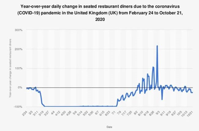 截止2020年10月21日,英國(guó)餐廳就餐者的比例比去年下降了26.54%。