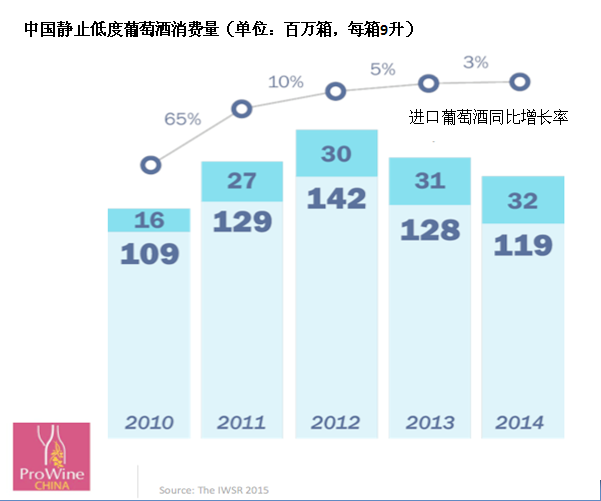 上周在ProWine China的展覽會上,引用國際葡萄酒及烈酒研究機構的數據來說明,中國市場是如何在2010年到2011年之間實現快速增長,到2012年達到頂峰,又是如何在過去的兩年里開始回落的。