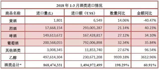 2018年1-3月,進口酒類市場延續(xù)高增速,增幅略有回調:除黃酒下行外,各主要酒類保持增勢,烈酒、啤酒、葡萄酒量額均有不小幅度增長。