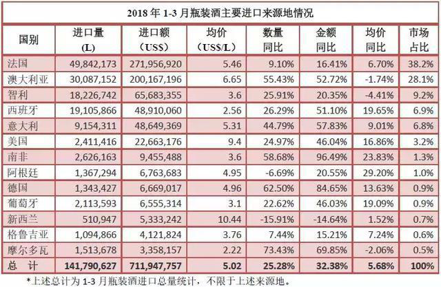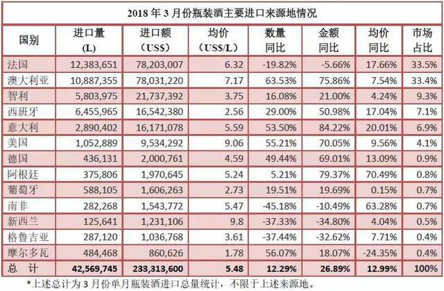 從3月份單月數(shù)據(jù)看,瓶裝酒進口量4257萬升,同比增長12.3%,進口額2.3億美元,同比增長26.7%。各主要進口來源地整體呈上行態(tài)勢,就前五大進口來源地而言,僅法國量額雙雙下行,澳大利亞、意大利增速領跑,智利、西班牙亦有不小增幅。