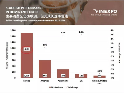 可以看出主要消費區仍為歐洲,但增長速率已十分低迷。亞洲和獨聯體國家的增長速度領跑全球。根據Vinexpo IWSR的預測,到2021年,中國靜態葡萄酒的消費量的年復合增長率將達到3.3%。將增長23%,達到1億9300萬箱,其中靜態酒將達到1億9280萬箱。