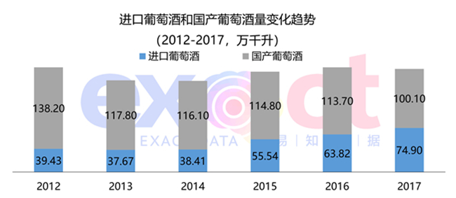 較之2013年,中國進口葡萄酒總量5年內翻了一番,2017年達到74.9萬升,增幅17.35%,而國產葡萄酒產量增速為 -11.95%。