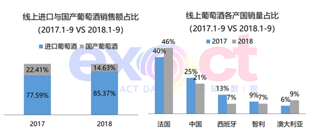 進口葡萄酒占據七成以上消費市場,從2018年數據顯示,再提升近8個百分點,有進一步搶占線上市場的勢頭。其中,法國葡萄酒最受消費者青睞,其次為國產葡萄酒。拉菲、長城和張裕連續兩年居線上銷售TOP3。