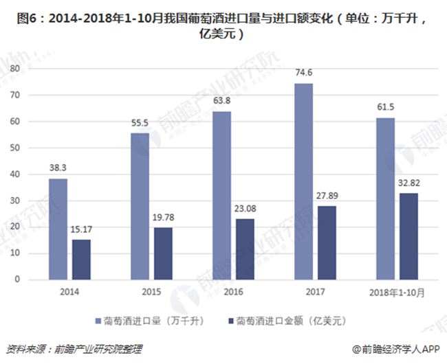 由下圖可見,隨著關(guān)稅降低,2014-2017年以來國內(nèi)葡萄酒進(jìn)口量和進(jìn)口金額逐年穩(wěn)步增長。2018年前10月,葡萄酒進(jìn)口依舊活躍,進(jìn)口量達(dá)61.5萬千升,進(jìn)口額實(shí)現(xiàn)32.82億美元,與國內(nèi)疲軟的產(chǎn)量數(shù)據(jù)形成對比,反映出我國對葡萄酒的需求仍然較強(qiáng),且進(jìn)口葡萄酒的市場占有力已經(jīng)遠(yuǎn)超國產(chǎn)酒。