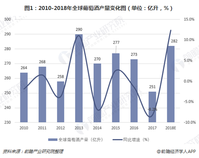 根據(jù)國際葡萄與葡萄酒組織(OIV)的數(shù)據(jù),2017年全球葡萄酒產(chǎn)量為251億升,下降8.2%,是近50年來最低值,主要系當(dāng)年歐盟各大葡萄酒生產(chǎn)國都受到了惡劣天氣的影響,歐盟各國產(chǎn)量降幅達(dá)14.6%。而2018年全球葡萄酒產(chǎn)量將大幅回升,預(yù)計(jì)實(shí)現(xiàn)282億升。