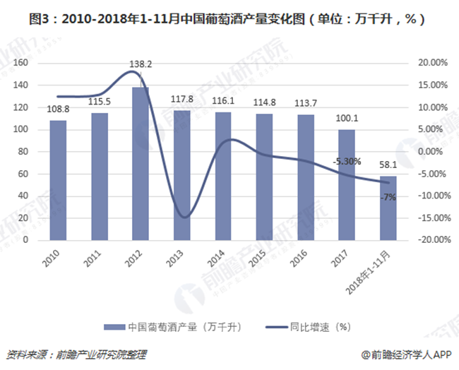 我國葡萄酒產(chǎn)量從2012年達(dá)到138.2萬千升的歷史高峰開始,一直在緩慢連續(xù)滑坡。根據(jù)國家統(tǒng)計(jì)局?jǐn)?shù)據(jù),2017年,全國葡萄酒產(chǎn)量100.1萬千升,累計(jì)下降5.3%;2018年1-11月,全國葡萄酒產(chǎn)量達(dá)58.1萬千升,累計(jì)下滑7%,若要趕超上年產(chǎn)量,12月的產(chǎn)量至少要達(dá)到42萬千升,而此數(shù)字比2018年前8個月的產(chǎn)量之和還多。結(jié)合目前數(shù)據(jù)看來,2018年國產(chǎn)葡萄酒產(chǎn)量大幅下滑已成定勢。