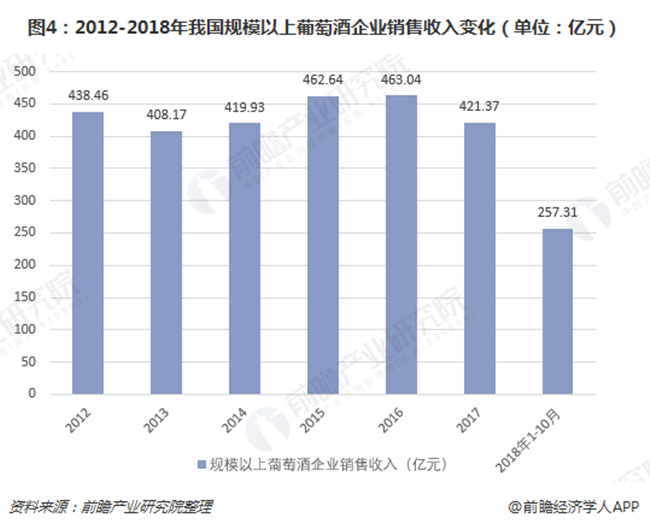 2018年前10月,我國規(guī)模以上葡萄酒企業(yè)銷售額為257.31億元,較上年同期下滑6.79%。進(jìn)入2018年,進(jìn)口葡萄酒大量涌入加上進(jìn)口葡萄酒產(chǎn)品價格區(qū)間進(jìn)一步下移,導(dǎo)致國內(nèi)葡萄酒市場尤其是中低價位葡萄酒市場競爭十分激烈。