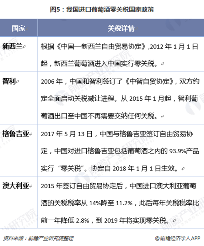 我國分別于2012年和2015年先后對新西蘭和智利進(jìn)口葡萄酒實(shí)施零關(guān)稅,僅需繳納消費(fèi)稅10%和增值稅16%。2018年起格魯吉亞進(jìn)口葡萄酒也加入零關(guān)稅隊(duì)伍。根據(jù)中澳自貿(mào)協(xié)定,至2019年,我國進(jìn)口澳大利亞葡萄酒的關(guān)稅將逐年降至零。關(guān)稅下行,不僅刺激著中國進(jìn)口葡萄酒市場的發(fā)展,使進(jìn)口葡萄酒的競爭進(jìn)入白熱化階段,對中國國產(chǎn)葡萄酒市場份額的擠壓也是無可避免。