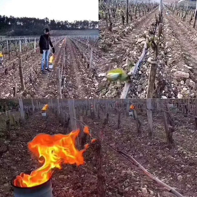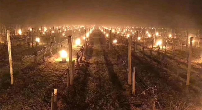 為避免已經(jīng)開始發(fā)芽的葡萄遭受低溫侵害,數(shù)以百計的人們在葡萄園內(nèi)用草生火,并使用燃燒的火盆來抵抗霜凍。
