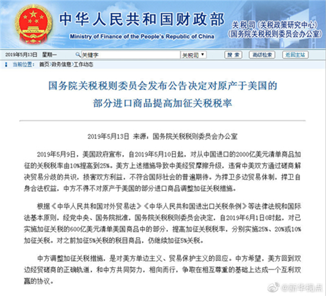 自2019年6月1日0時(shí)起,對(duì)已實(shí)施加征關(guān)稅的600億美元清單美國商品中的部分,提高加征關(guān)稅稅率,分別實(shí)施25%、20%或10%加征關(guān)稅。