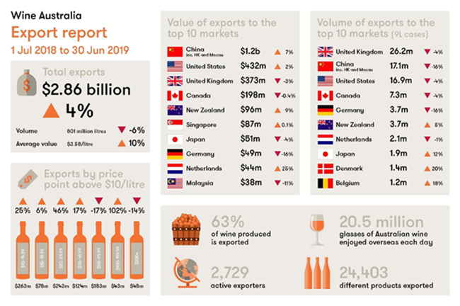 Clark 先生說,澳大利亞葡萄酒對中國市場的出口額(包括香港和澳門)刷新了財年記錄。截至2019年6月底的這一財年,出口總額增長了7%至12億澳元。而出口總量則降低了16%至1.54億升(等量于1,700萬桶9升裝)。這主要是受到價格區(qū)間低于2.50澳元/升(離岸價)的葡萄酒出口量較低的影響。