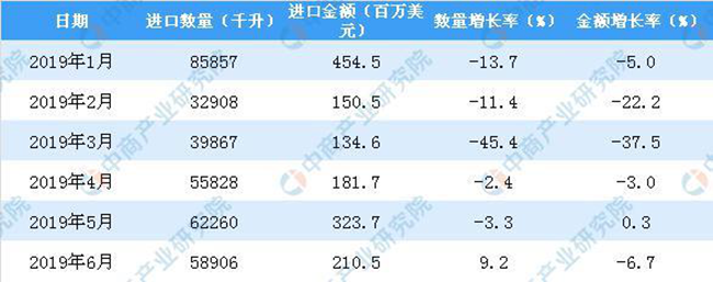 2019年1-6月中國葡萄酒進口數量及金額增長率情況