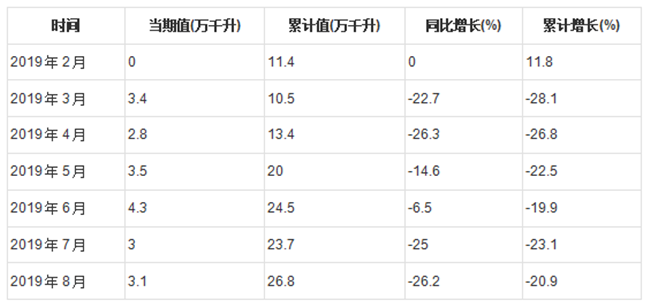 2019年1-8月全國葡萄酒產量分月數據