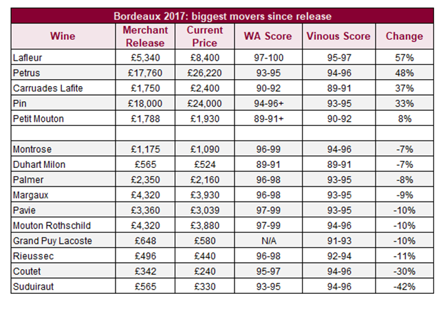 與2016年份一樣,拉弗爾Lafleur的表現(xiàn)最佳,目前價格比發(fā)布價漲了57%。一級酒莊的副牌葡萄酒也再次熱賣– 小拉菲Carruades Lafite漲價37%,而小木桐Petit Mouton則漲價8%。