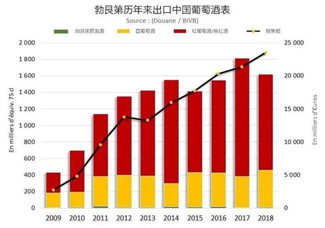 2018年勃艮第出口了1600萬瓶葡萄酒到中國大陸,這個數(shù)量比2017年同期降低了10.6%,但出口價值達到了2350萬歐元,比2017年同期上漲了9.9%。