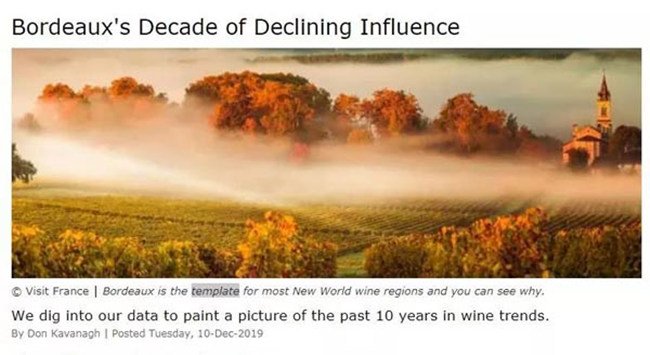 最近,葡萄酒搜索引擎“葡萄酒搜索器”(Wine-searcher)將其2019年的葡萄酒搜索數據與2010年的進行了對比,并總結出數據的各種不同之處,發表題為《波爾多影響力衰退的十年》的文章。