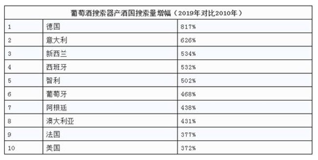 數據顯示,2019年在葡萄酒搜索器搜索量排名前十位的葡萄酒產酒國分別為法國、意大利、美國、西班牙、澳大利亞、葡萄牙、智利、阿根廷、德國與新西蘭。這份榜單的排位與2010年有些許不同。在2010年,美國在意大利之前,阿根廷則排列在智利之前,新西蘭在德國前面。