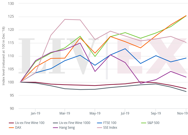 為了更好地反映優(yōu)質(zhì)葡萄酒的表現(xiàn)情況,下圖將Liv-ex 100和Liv-ex 1000與全球股票進(jìn)行比較。盡管優(yōu)質(zhì)葡萄酒指數(shù)相對穩(wěn)定,但由于利率下調(diào)提高了投資者承受風(fēng)險的意愿,使其表現(xiàn)仍遠(yuǎn)遠(yuǎn)落后于全球股市。恒生指數(shù)一向表現(xiàn)平平的香港,成為了優(yōu)質(zhì)葡萄酒需求的主要來源。 事實(shí)上,自春季以來,該指數(shù)和上證綜合指數(shù)一直下跌。