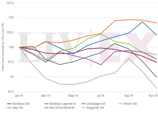 在所有分項(xiàng)指數(shù)中,只有香檳50和意大利100在2019年度出現(xiàn)正增長,分別上升2.2%和4.6%。在過去一年,由于這兩酒區(qū)的悠久歷史和品牌力量,以及一系列的出色年份和相對較低入市價格,日漸受酒評家和市場的高度關(guān)注,令它們交易增加和價格上升,表現(xiàn)勝于勃艮第和波爾多。事實(shí)上,香檳和意大利仍未包括在美國最近的新關(guān)稅葡萄酒之列,因而進(jìn)一步受惠。