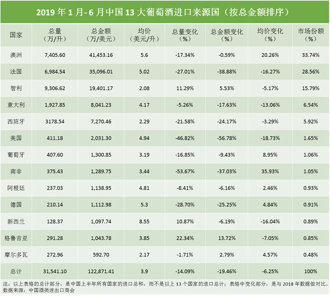 中國酒類進出口商會(China Chamber of Alcohol Importers and Exporters)公布了 2019 年 1 月- 6 月中國的 13 大葡萄酒進口來源國及相關數(shù)據(jù):