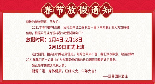 白駒過隙,又是一年春節到!惜別2020年,迎來了充滿希望、機遇和挑戰的2021年!正值中國的傳統節日“春節”來臨,在此藍菲酒業全體員工向大家拜個早年!恭祝大家新春快樂,財源廣進!...